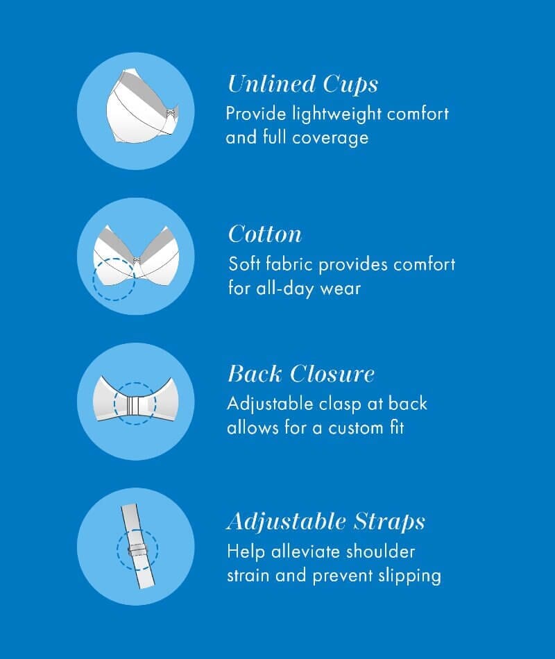 • With breathable, soft cotton fabric and unpadded, wire-free cups, you will barely even notice that you're wearing a bra!